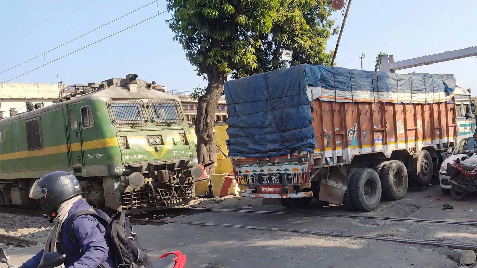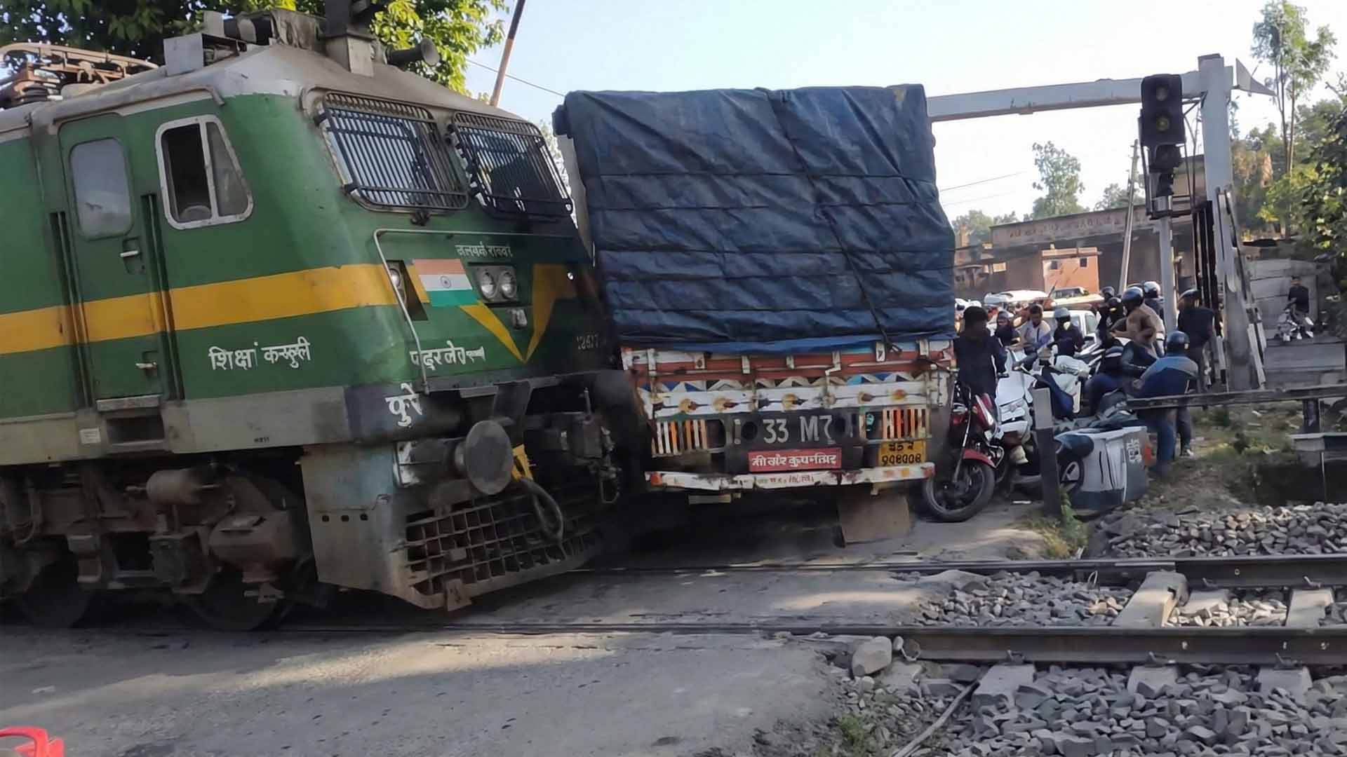 The incident occurred around 9:38 a.m. at the crossing near Jasidih, a congested stretch that sees heavy vehicular traffic daily. According to railway officials, the express train rammed into the truck that had stalled on the tracks, but the driver’s quick reaction limited the damage. The impact crushed two motorcycles waiting at the gate, leaving their riders with minor injuries — cuts and bruises that required only first aid. Both were discharged after treatment at a nearby hospital.